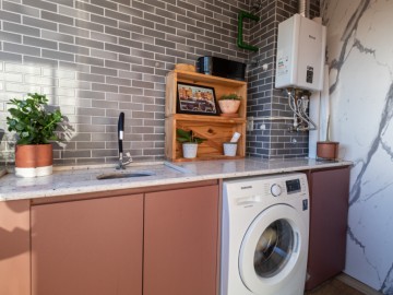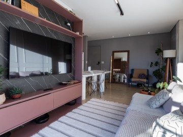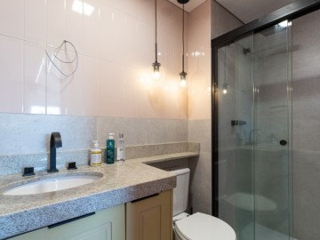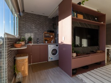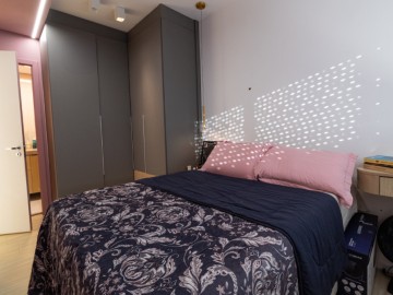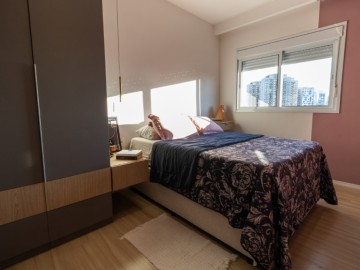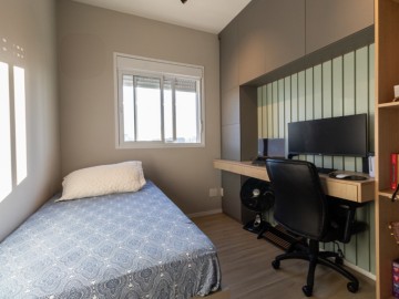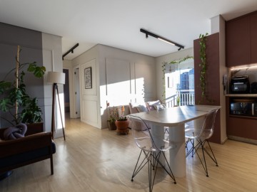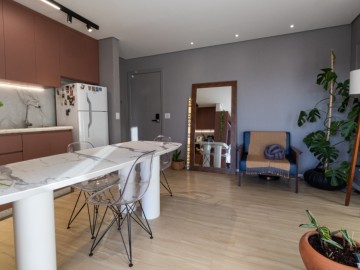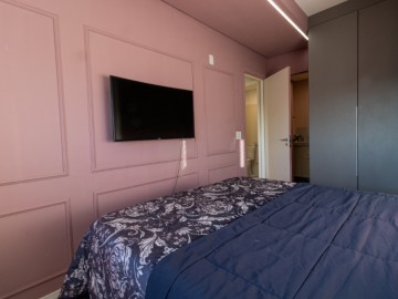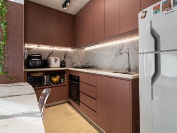 O apartamento possui uma cozinha integrada e uma copa, proporcionando um ambiente amplo e acolhedor. A área de serviço é funcional e o piso vinílico oferece beleza e facilidade de manutenção, enquanto os móveis planejados otimizam os espaços. O imóvel ainda conta com infraestrutura para ar-condicionado, interfone e vista para a cidade.