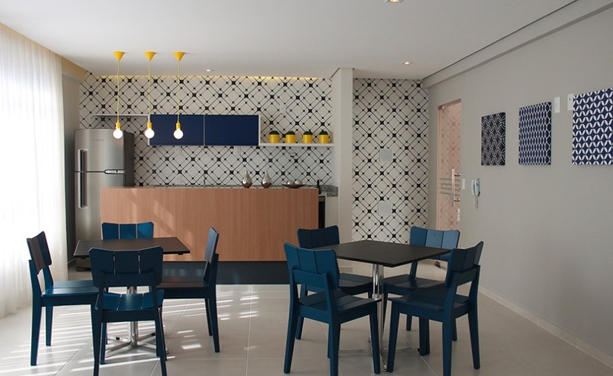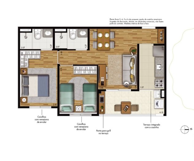 Layout inteligente: 2 dormitórios (1 suíte), banheiro social, sala ampla para 2 ambientes, terraço grill integrado à cozinha e área de serviço.