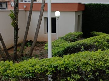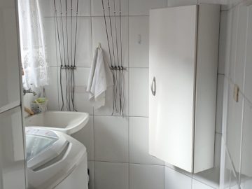 Garagem com amplo espaço para 3 veículos, com armário grande, depósito, casa de gás e lixeiras;