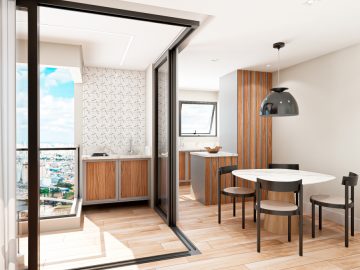Com 56,85 m2 de área útil interna; banheiro social; ampla Sala de Estar, Sala de Jantar, Varanda Gourmet, Cozinha; área de serviço, 1 Vaga de Garagem coberta e demarcada ;