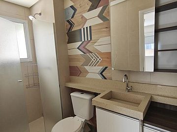 Ampla Sala para 2 ambientes, quintal com área gourmet, banheiro social com gabinete e box de vidro, cozinha com móveis planejados, área de serviço (separada) e 1 vaga de garagem coberta e determinada; Banheiro da Suite com planejados;